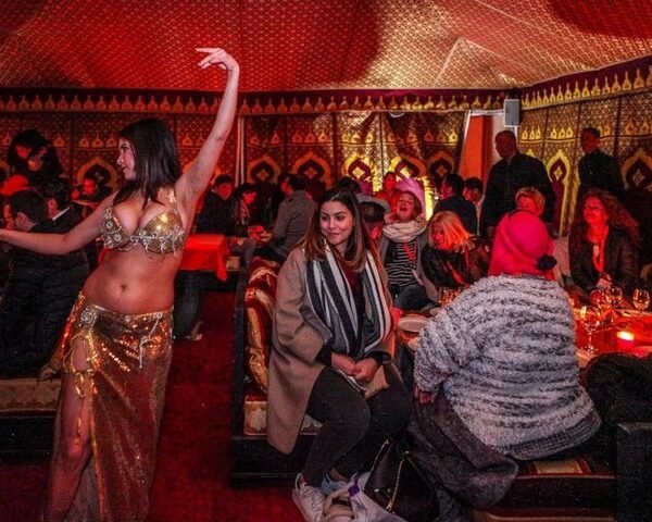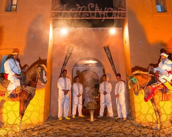 Upon arrival, you’ll be greeted by elegantly dressed guards and welcomed with traditional dates and milk. Take your seat in authentic Caidal tents and enjoy a delicious Moroccan feast, accompanied by live music from different regions of the country.