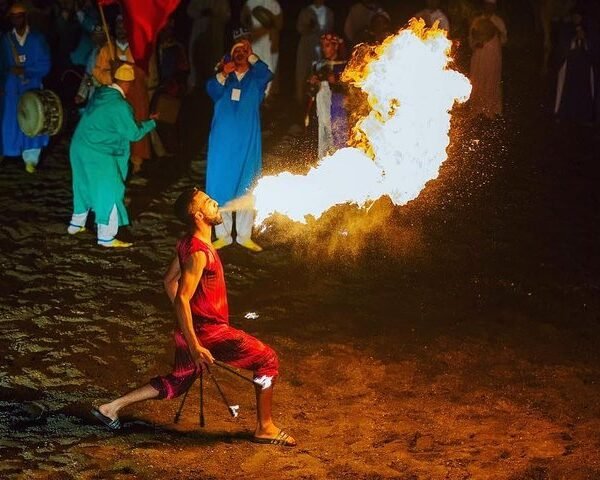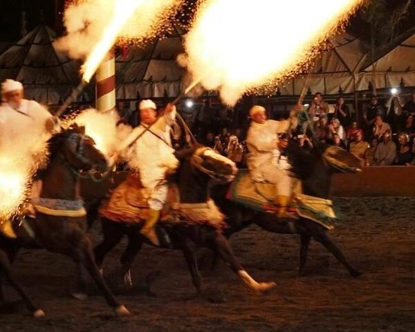 The evening reaches its peak with the breathtaking Fantasia (Tbourida)—a powerful display of horsemanship where riders charge forward and fire antique muskets in perfect unison. It’s a thrilling and unforgettable spectacle.